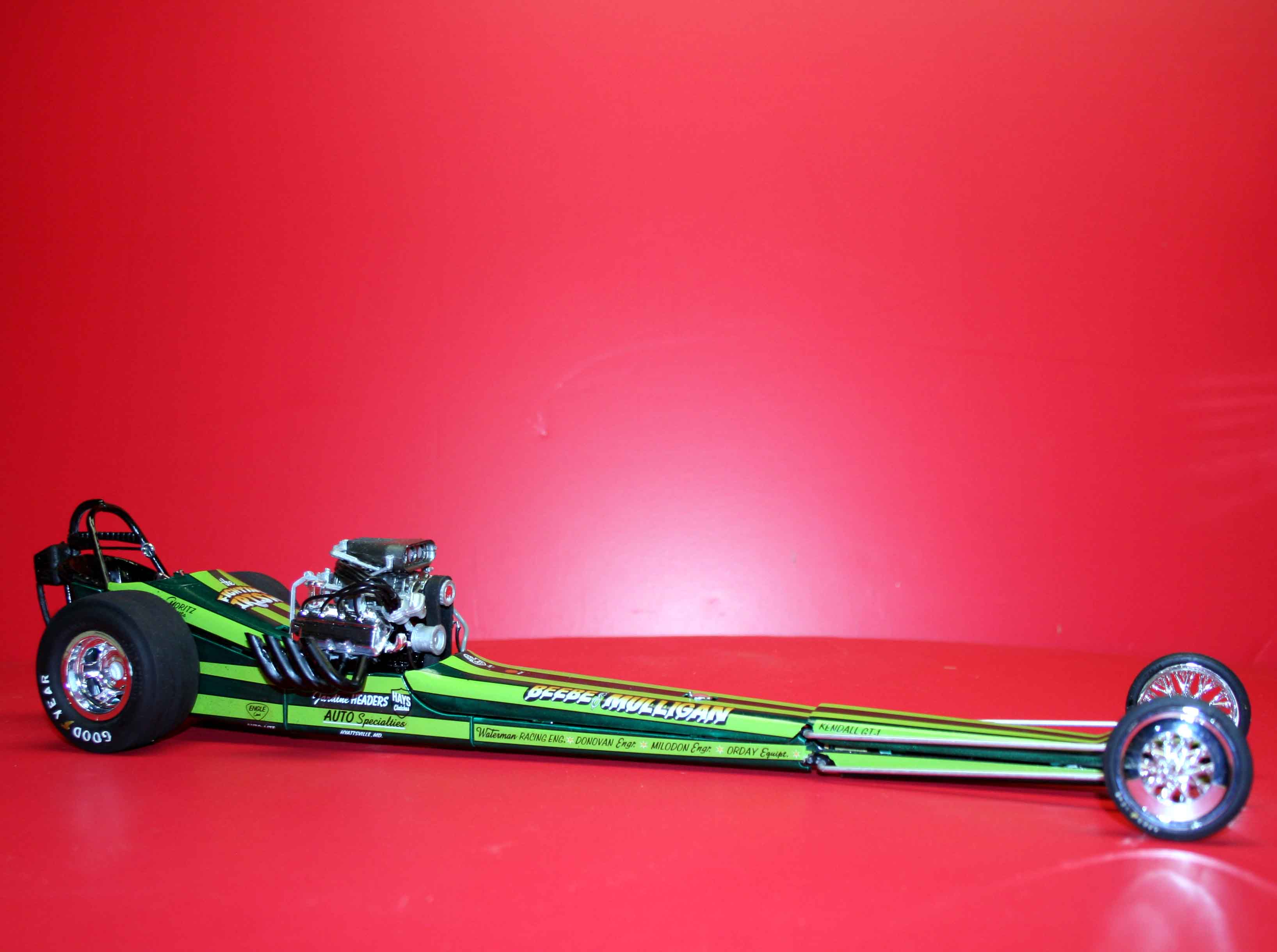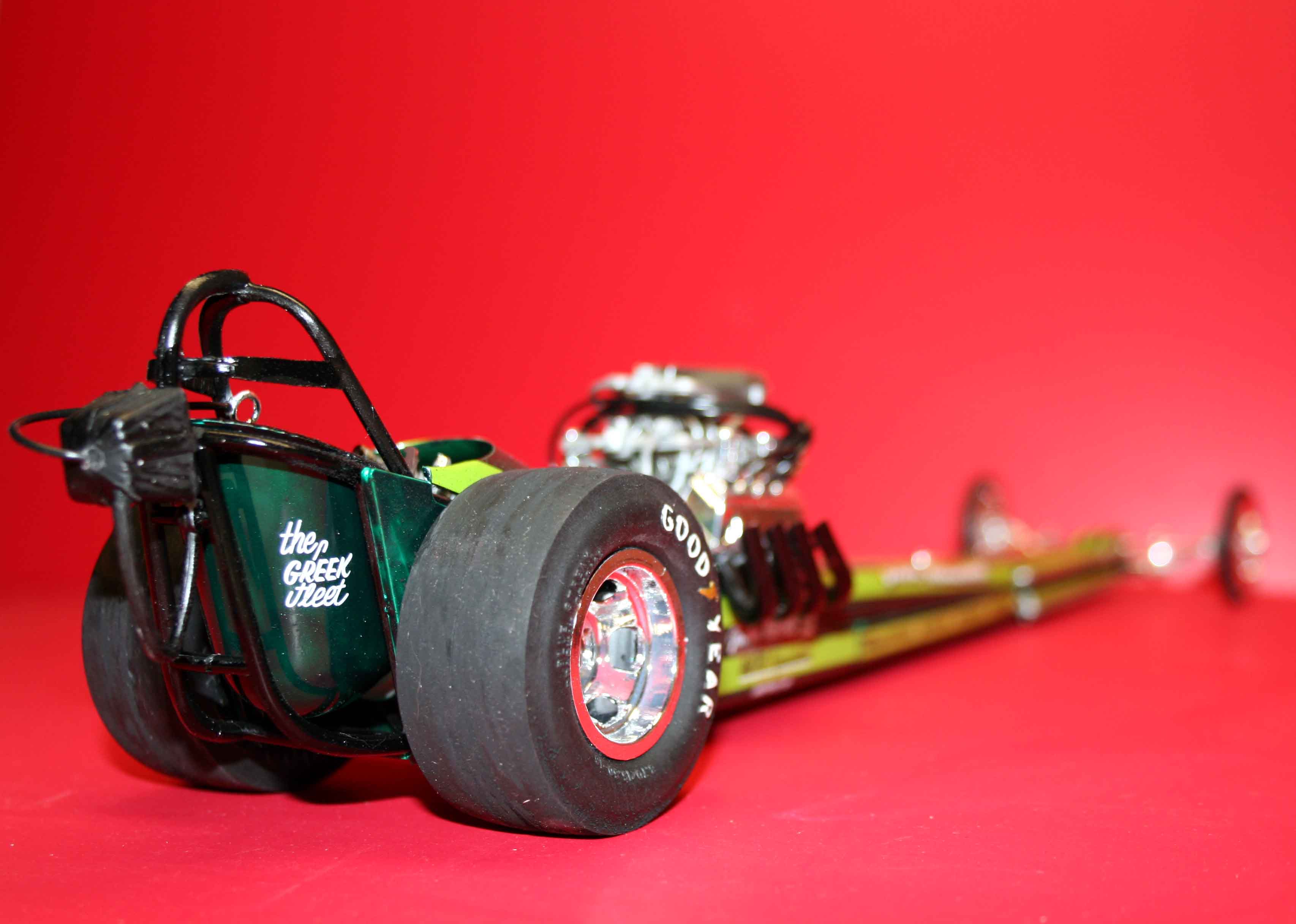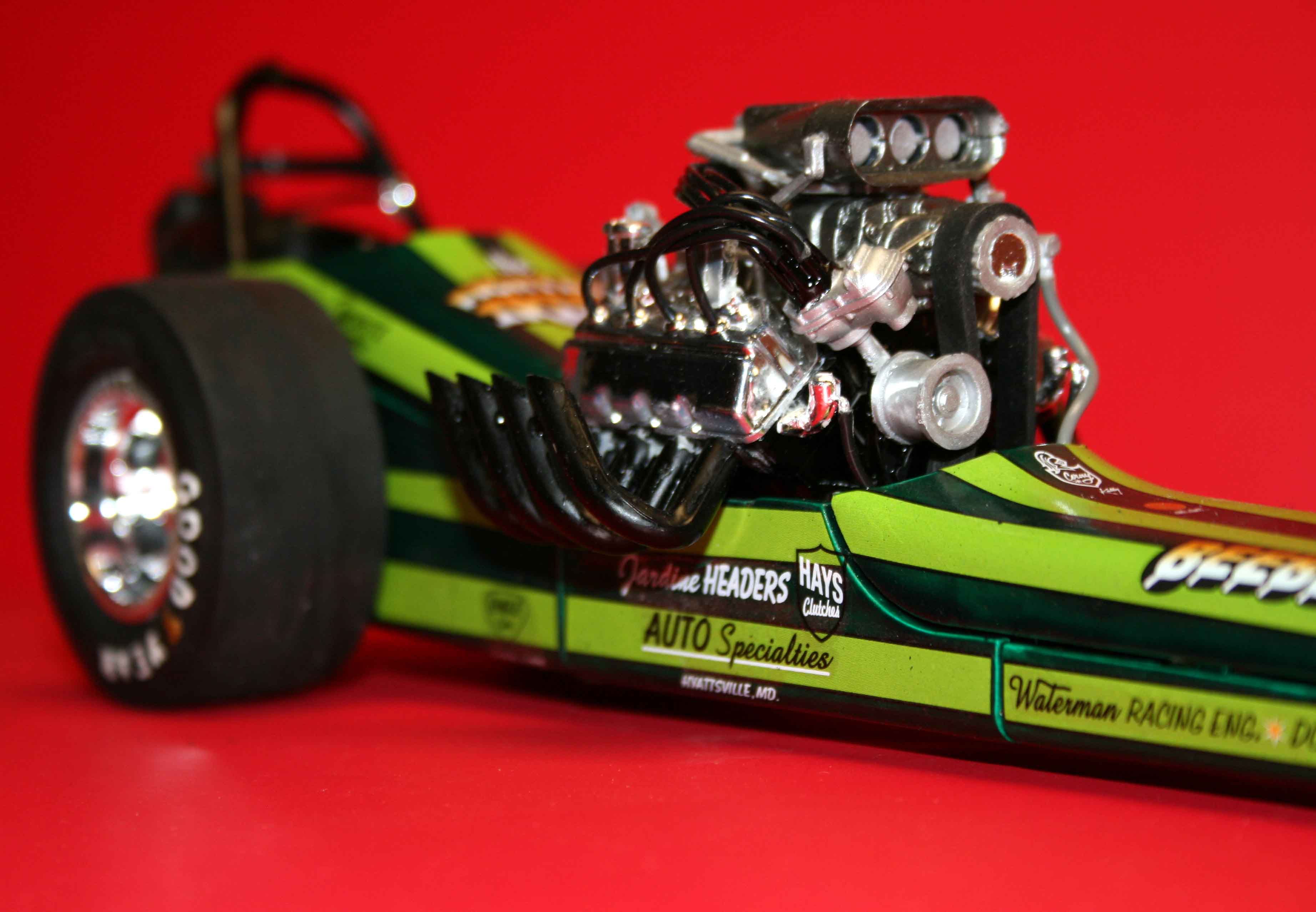 Revell Beebe & Mulligan Rail Dragster. This 1969 Quarter-miler tripped the lights at 6.43. Imagine yourself trying to do that and you can’t even see where you’re going and you are literally sitting on the differential. YUM! The use of aluminum tubing to replace the drag links is a big improvement as the ones supplied in the kit are wavy and rough. Decals require patience. Make sure to advise everyone at home before beginning that you are not to be disturbed when applying them and use decal softener.