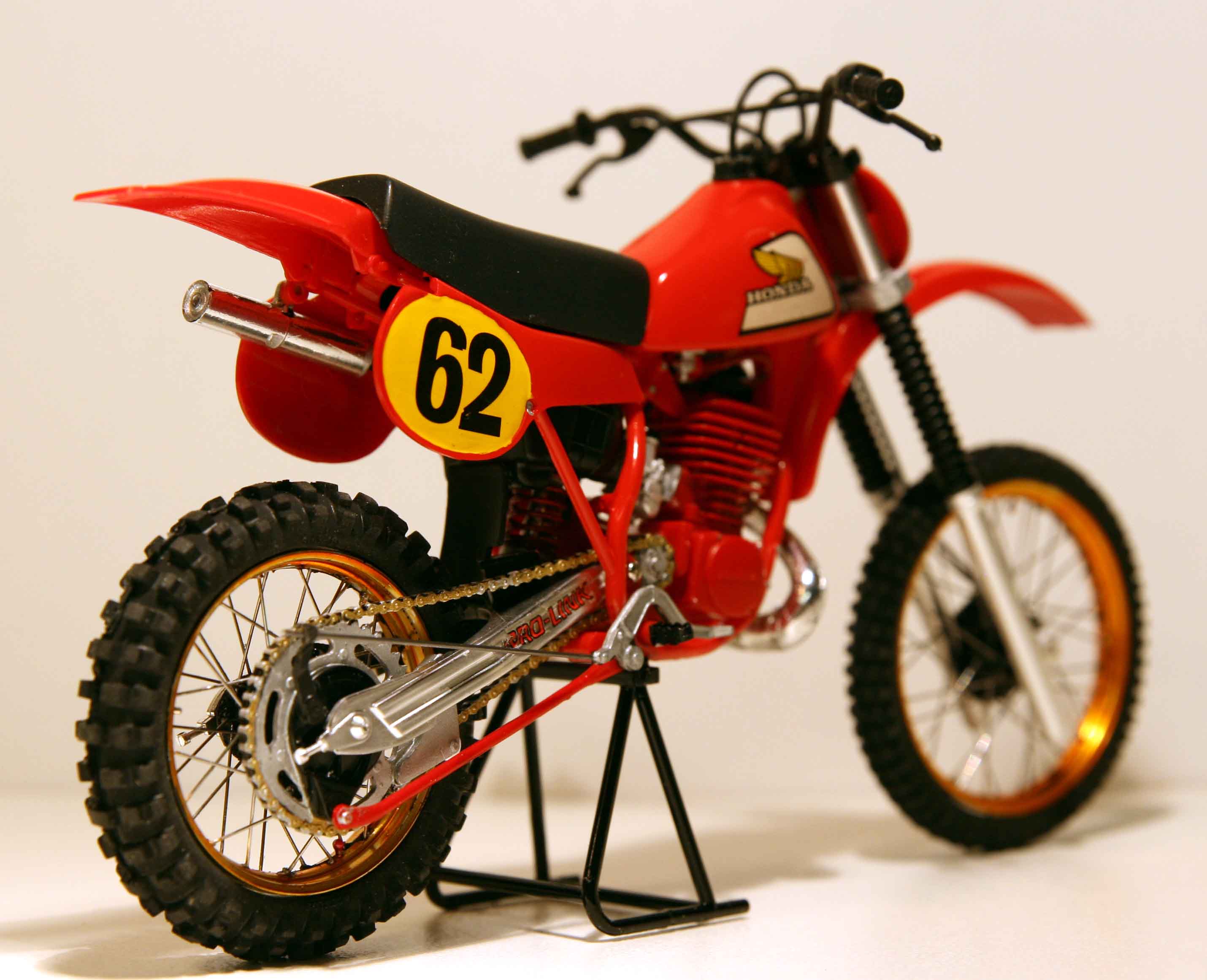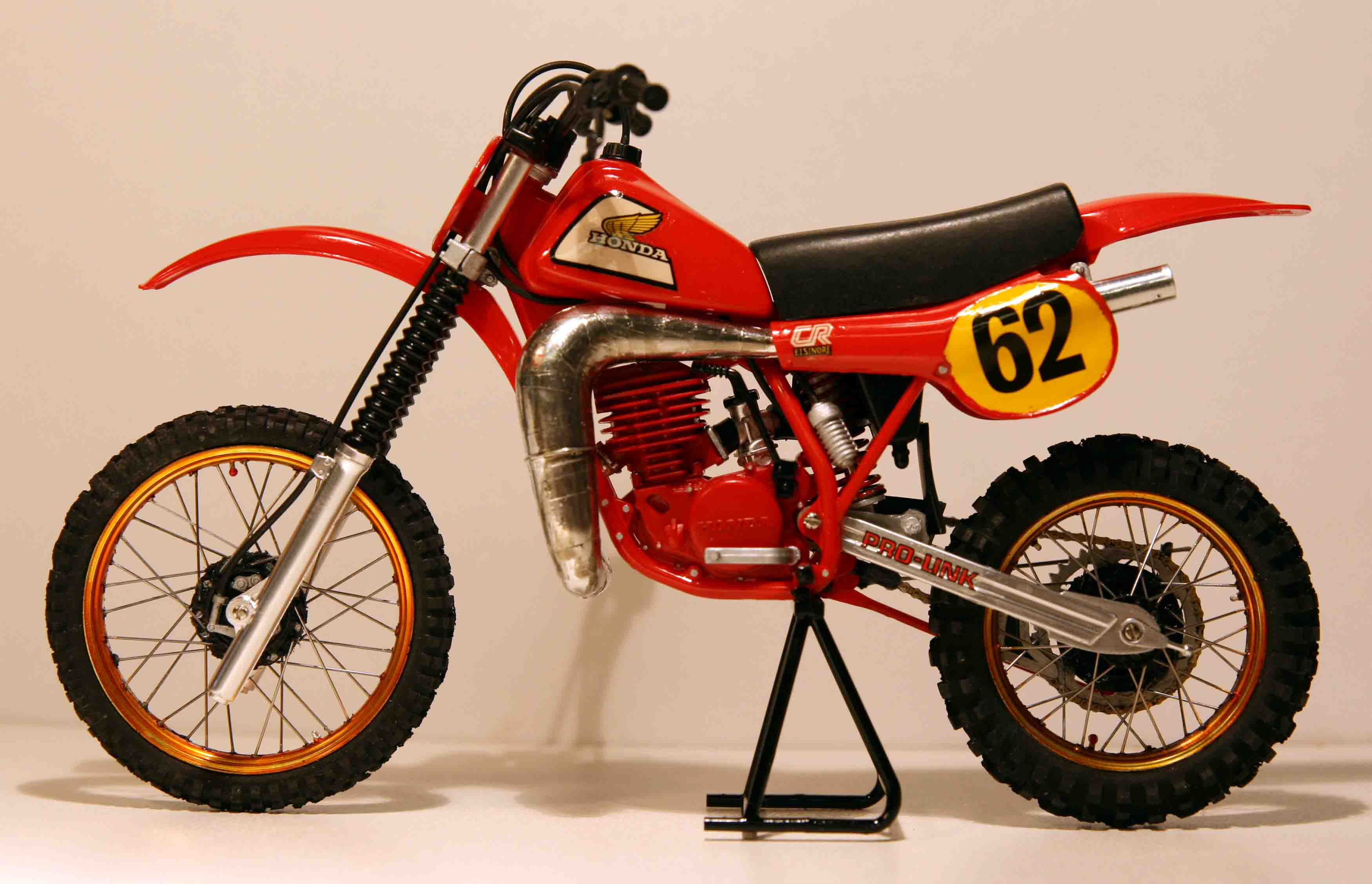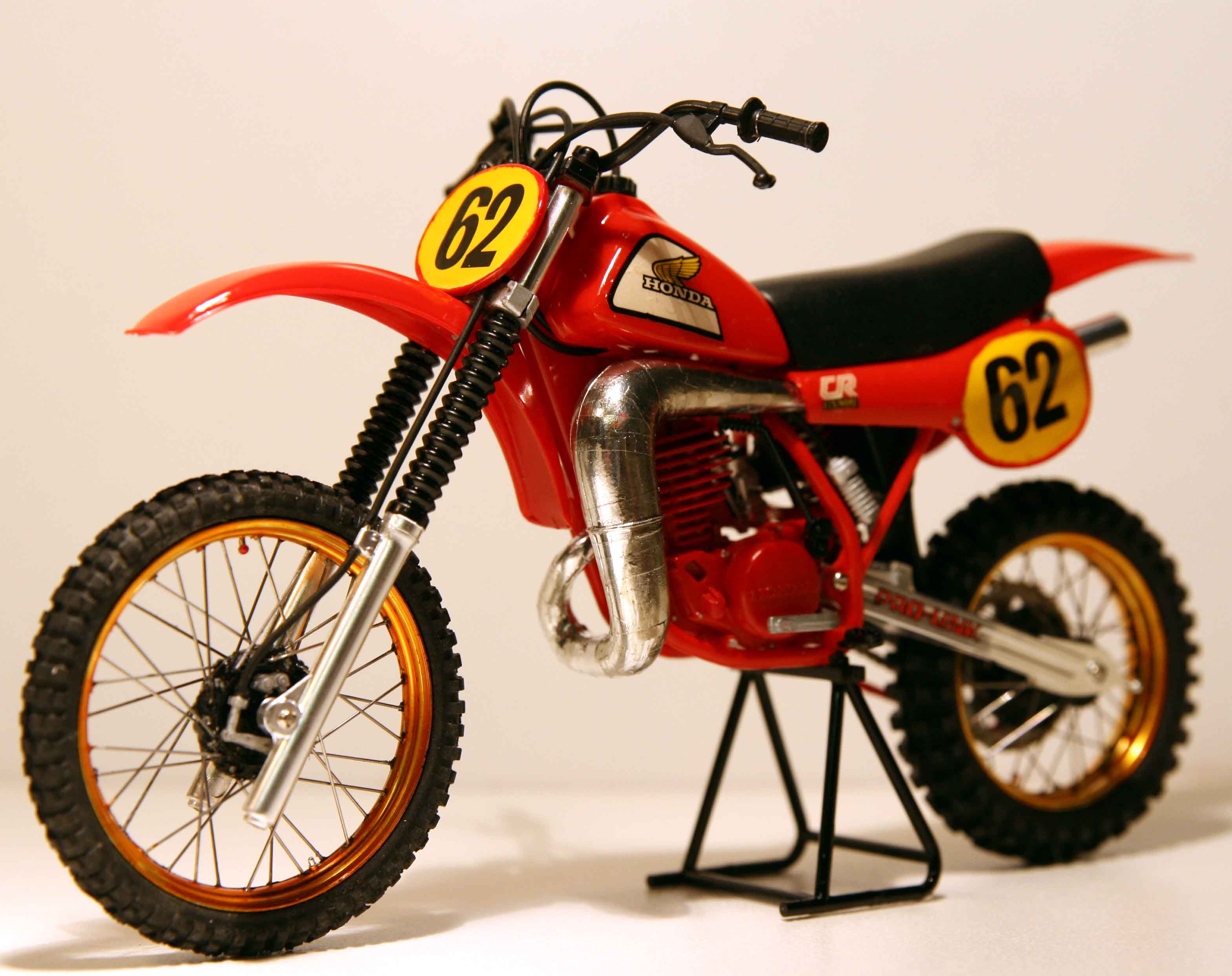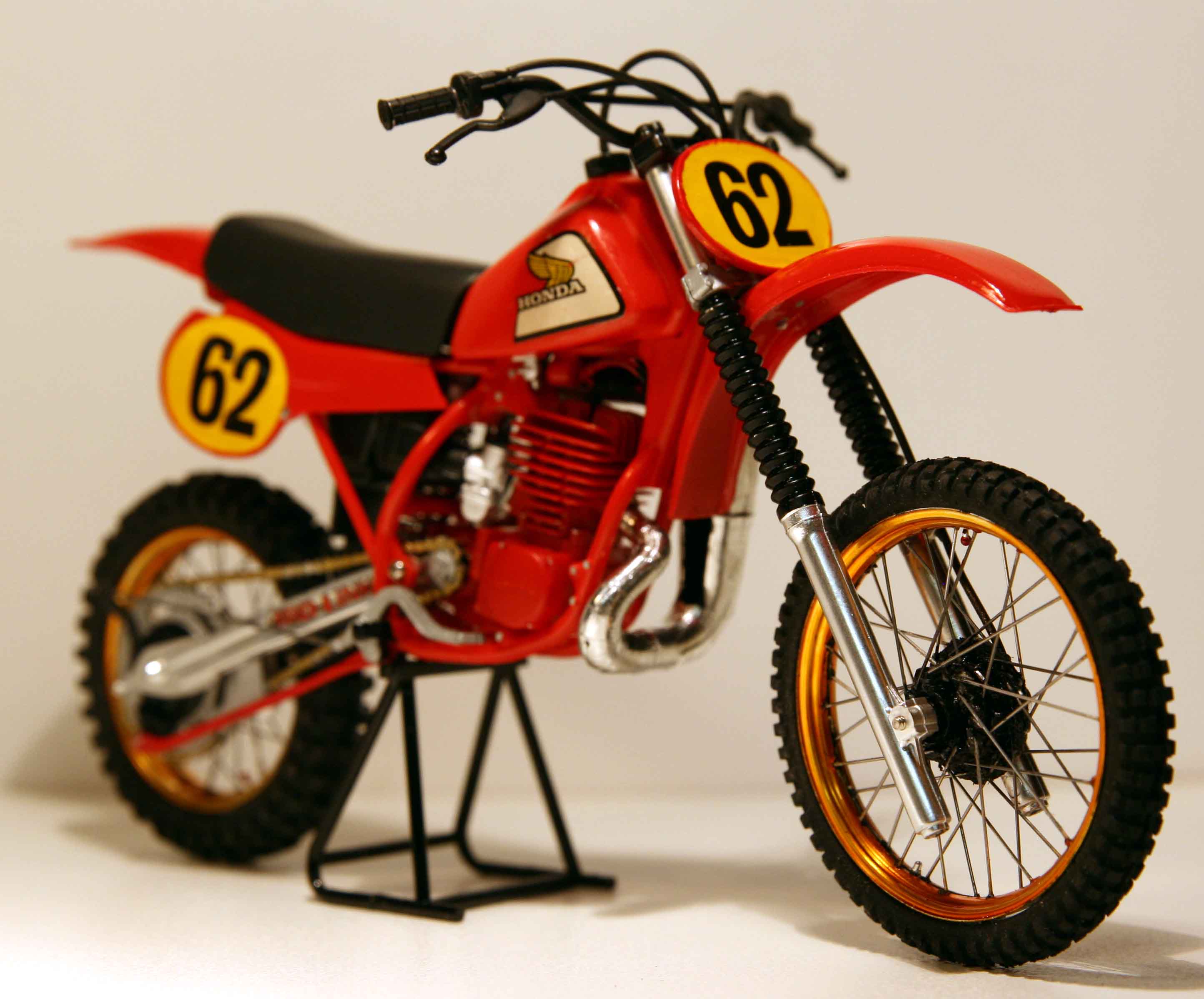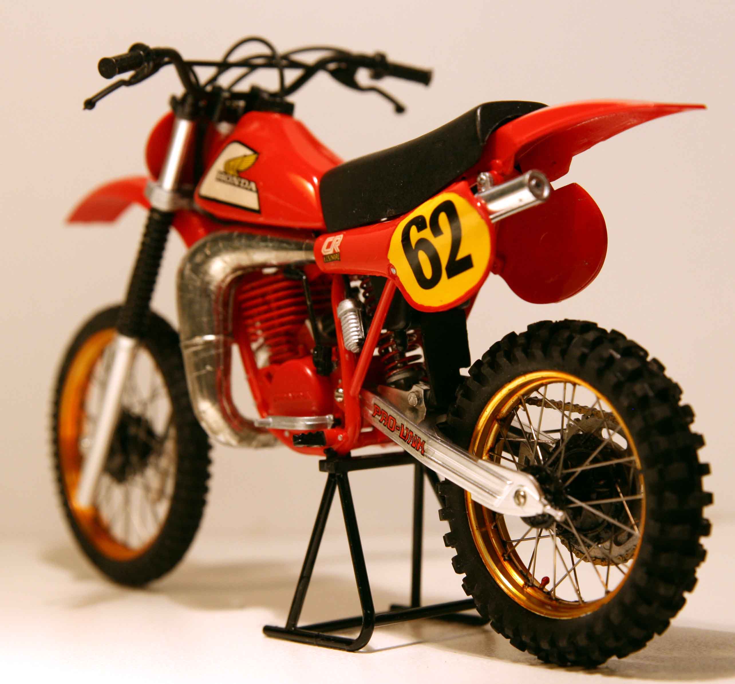 Honda 1/12 scale CR450R. Additions include gold anodized rims like the Excel item which was done using Tamiya clear orange X-26 over the stock aluminum finish, expansion chamber covered in bands of Bare-Metal chrome foil to simulate a hand-built pipe and .015 wire spokes.