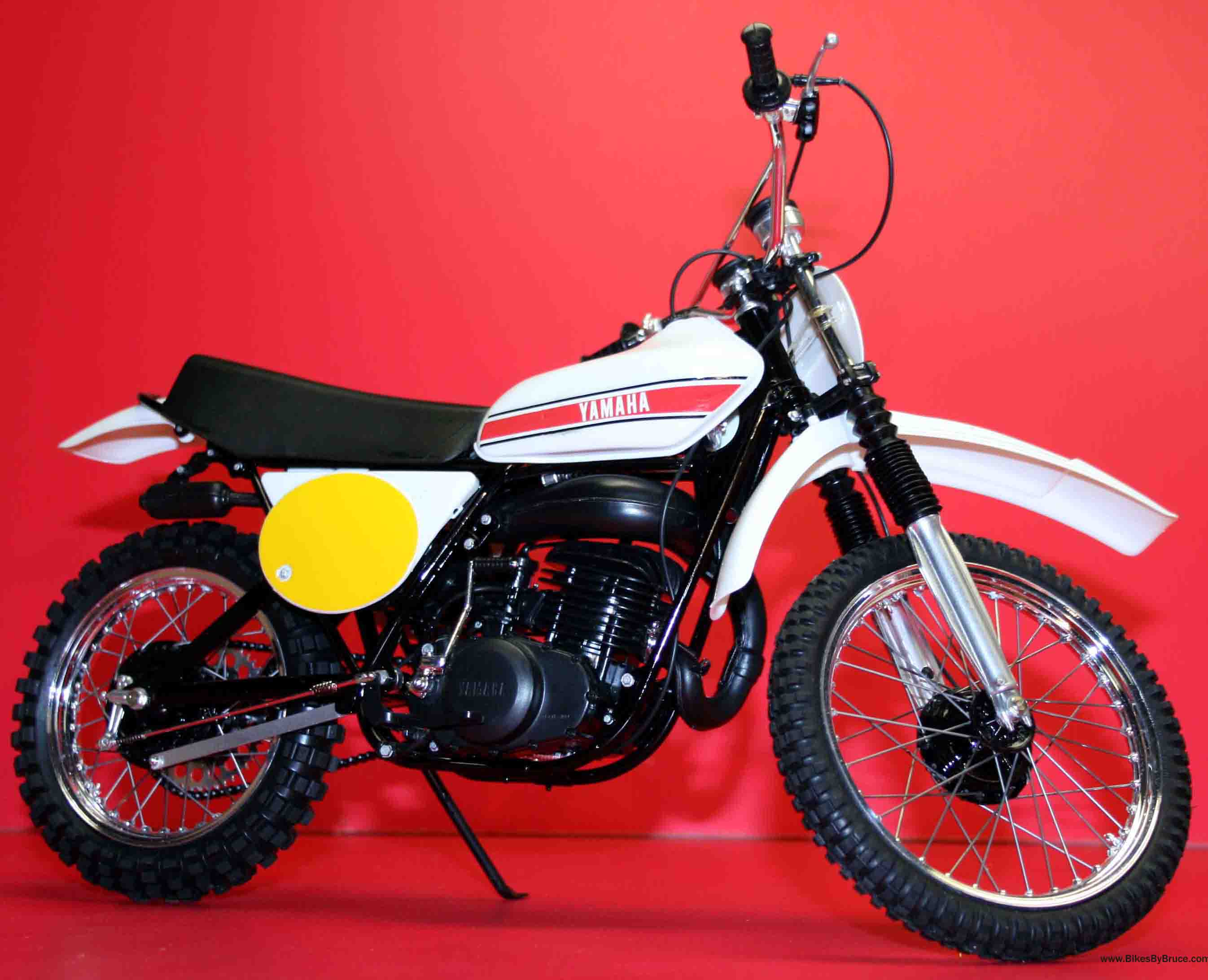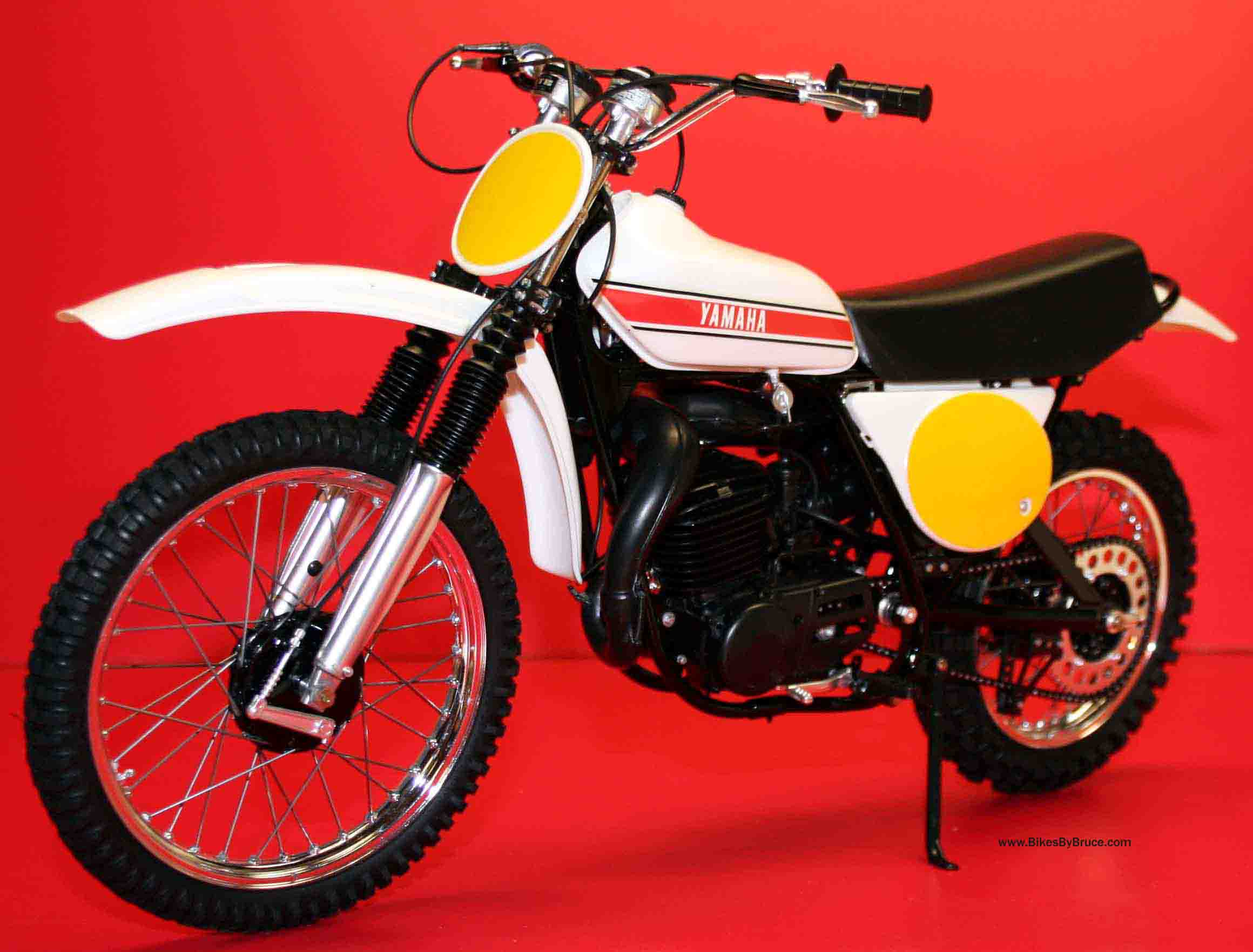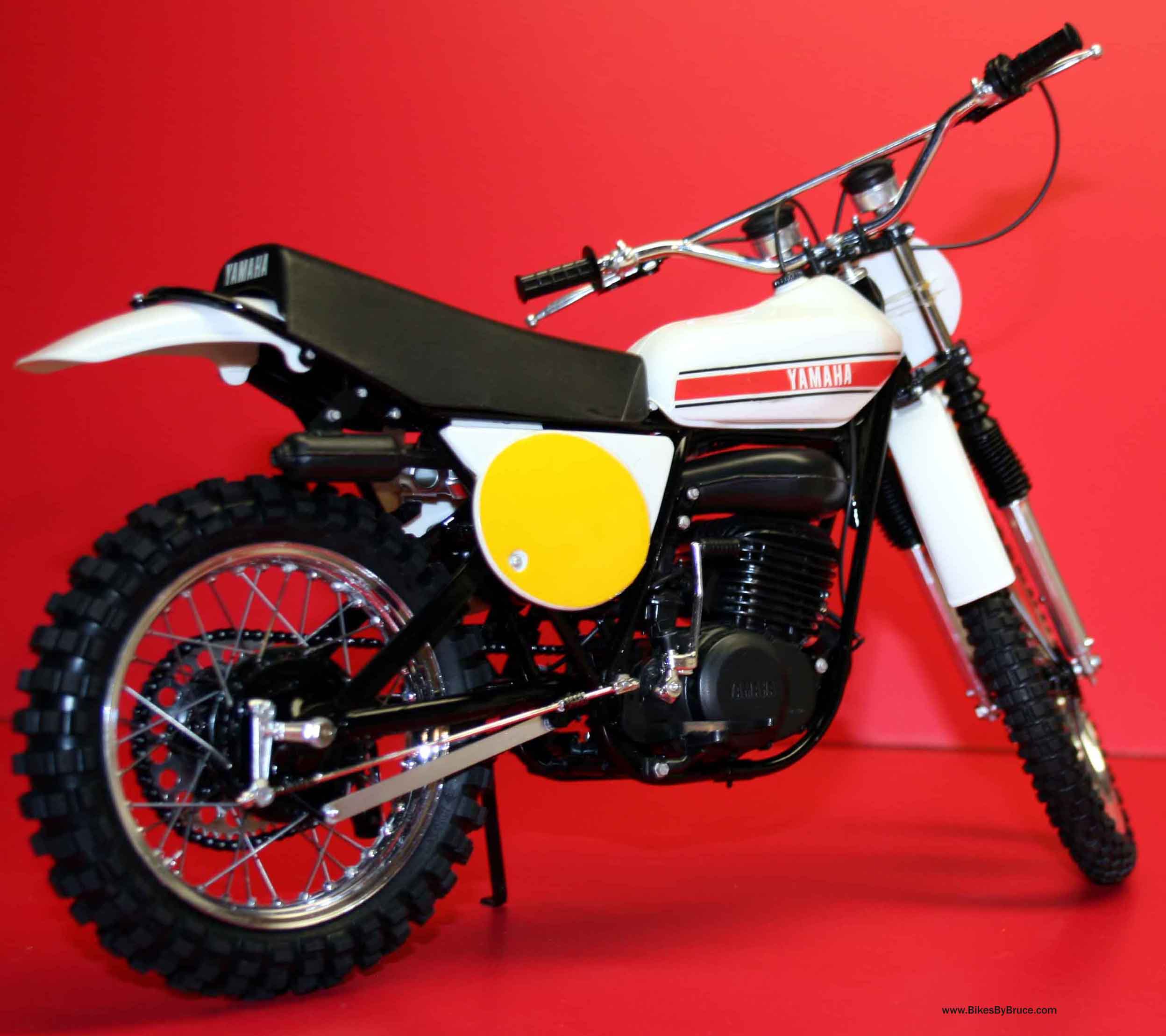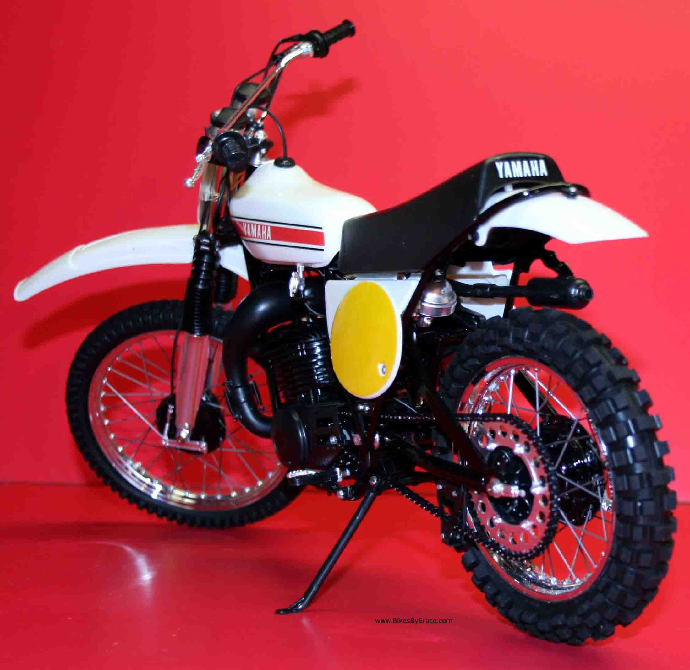 This is the production model of the ride that took Hakan Anderson to the 1973 250GP World Championship. The model does come with red number plate decals as well for making that detail historically correct. Maico started the long travel suspension game and altered MX permanently. Yamaha was quick to follow with their own unique approach to long travel rear suspension. Anyone who owned a ‘70s monoshocker will find assembling this kit almost like working on the original. Super detail right down to the real steel springs holding the header pipe and expansion chamber together, this one really shines (IMO) with my piano wire spokes adding the extra level of realism. This is a 1/6 Tamiya and they really know their stuff. One of the keys to making this model very authentic-looking is to use either flat, semi-gloss or gloss black as spelled out in the instructions. The rattle cans are the last word in great finishes but make sure it's in a well-ventilated area and use only Tamiya products for the best result. Regarding the clear coat, you may wish to just brush on Tamiya Clear over the decals and leave the fenders, tank and side panels the natural finish. The original was all plastic anyway (the strapped tanks were alloy) and the parts are a pretty good match straight out of the box. The clear coat brushed over the decals will allow them to stay put for decades without flaking and falling off.