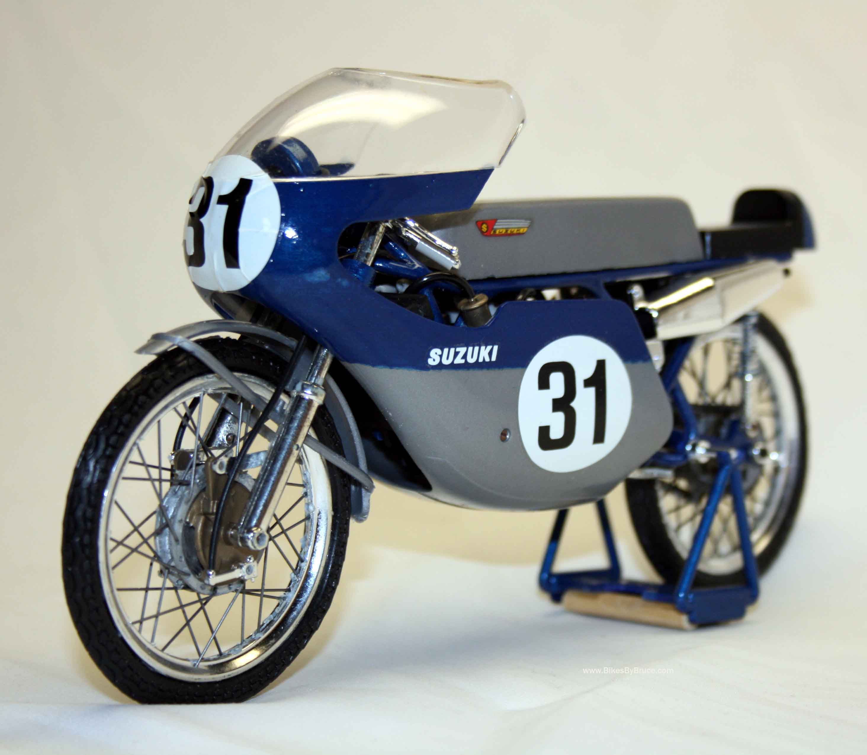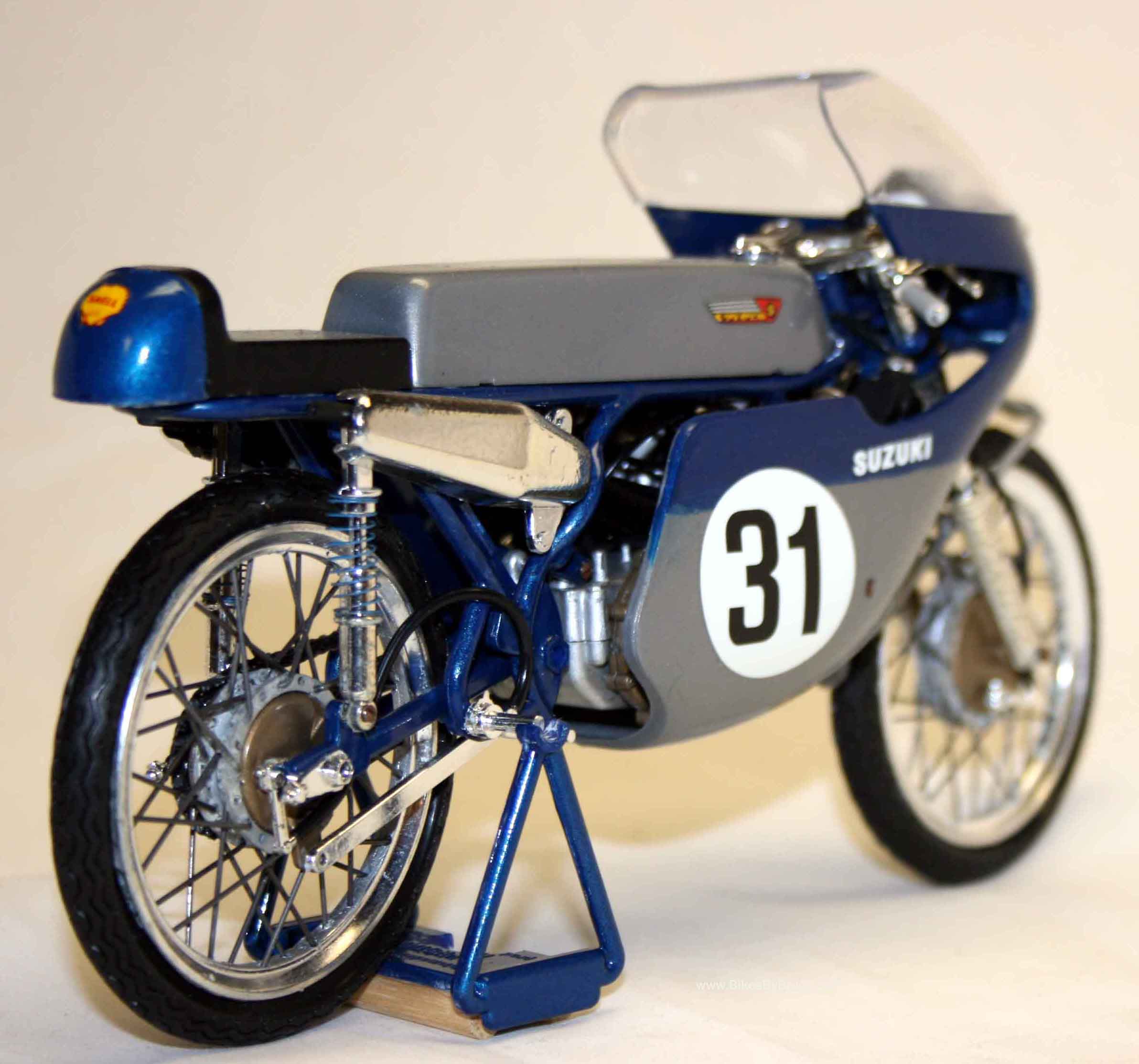 Rotary valve setup that Rotax has since employed brilliantly. This 1/9 Protar copies the 1966 model that Hans Georg Anscheidt rode to world champion finishes three years in a row. 16 hp @ 18,000, water-cooled and 170km per hour.